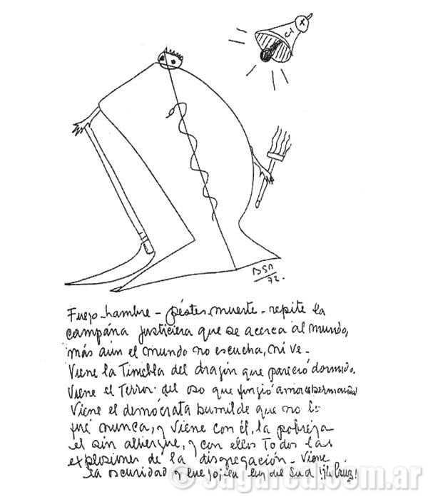 "Fuego - hambre - pestes - muerte - repite la campana justiciera que se acerca al mundo, mas aún el mundo no escucha, ni ve. Viene la tiniebla del dragón que pareció dormido. Viene el terror del oso que fingió amor y hermandad. Viene el demócrata humilde, que no lo fue nunca, y viene con él la pobreza, el sin albergue, y con ellos todas las explosiones de la disgregación. Viene la oscuridad y luego ¡la luz del Sud! ¡la Cruz!" (BSP 1972)